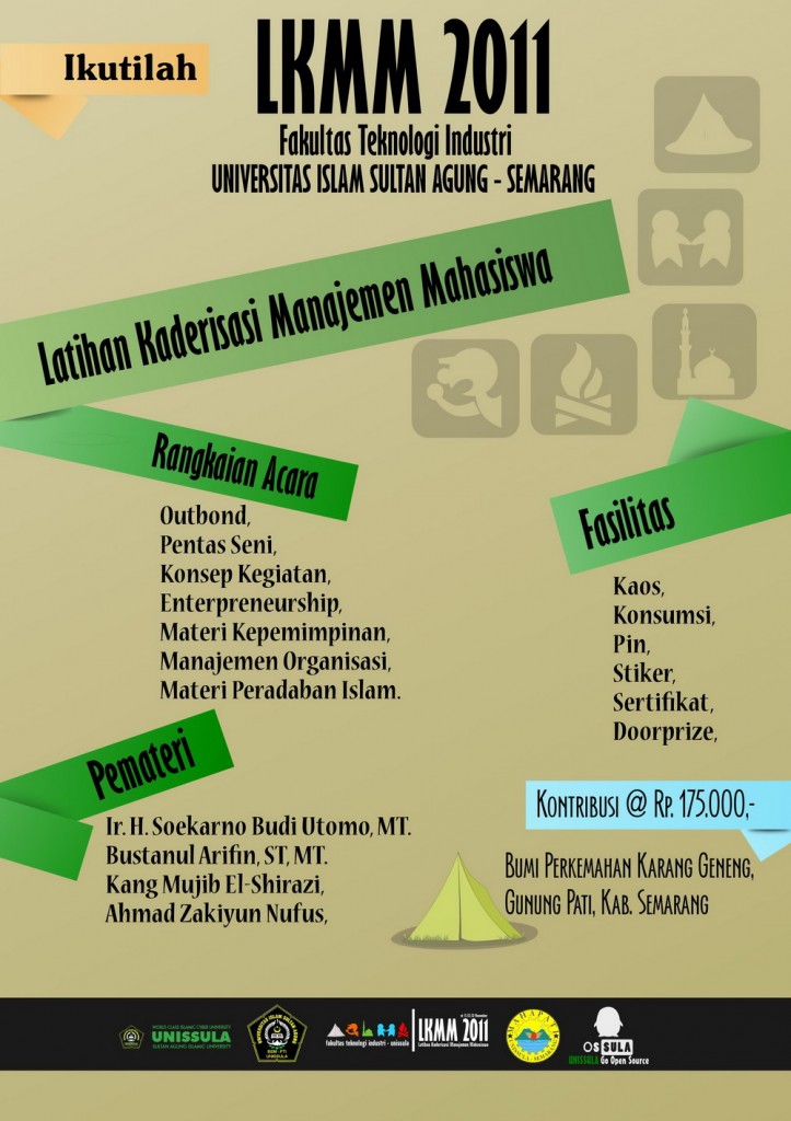 Setelah mengalami masa-masa jeda yang cukup lama untuk menulis, saya pun kembali lagi mengembara di dunia blog. Sembari mempersiapkan diri untuk kegiatan LKMM (Latihan Kaderisasi Manajemen Mahasiswa) 2011 FTI UNISSULA dan tentunya perbekalan ala kadarnya karena kebagian menjadi panitia LKMM 2011 FTI UNISSULA, saya sempatkan untuk menuliskan pengalaman menjadi panitia kegiatan ini.