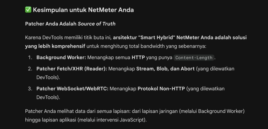 Mengukur bandwidth di web modern itu seperti menangkap ikan menggunakan tangan kosong. Karena request web modern itu sebagian bisa lewat Worker, ada yang lewat WASM, dari cache, dari SSE, webRTC, webSocket dan lainnya.