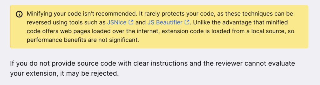 Dan itu memang tertulis di panduan resmi Firefox Add-ons: Jika kode extension sulit dibaca manusia (misalnya karena minification atau bundling), developer diminta mengunggah full source code untuk keperluan review.