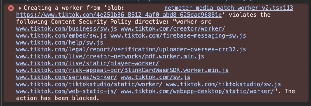 Ketika saya mencoba teknik yang sukses di Twitch yakni meng-inject script via patch window.Worker(), TikTok langsung mendeteksi perubahan dan membatalkan seluruh mekanisme worker internalnya.