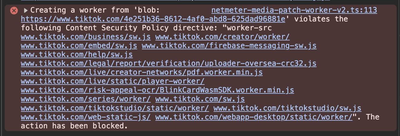 Alasannya adalah ketika kita mem-patch Worker, TikTok menerapkan CSP yang ketat dimana karna adanya ini di response body mereka: