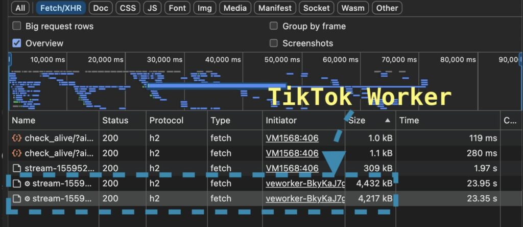 Justru inilah titik lucunya. Begitu worker mati, TikTok terpaksa memakai pipeline klasik yang lebih “ramah” bagi extension seperti NetMeter Web, dimana: