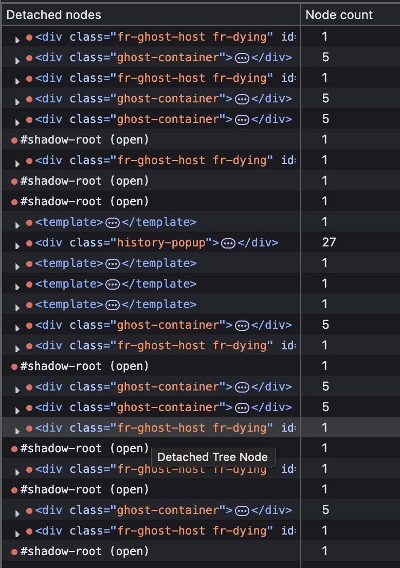 Dimana elemen <div class="fr-ghost-host"> yang sudah hilang dari layar, tapi “arwahnya” masih gentayangan memenuhi RAM karena kode JavaScript masih memegang referensinya lewat closure SolidJS tadi.